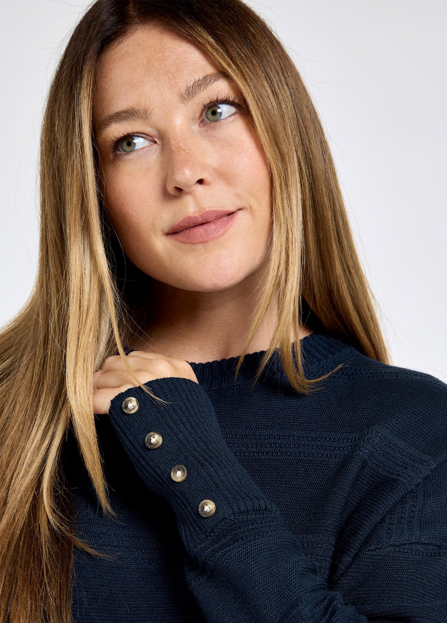 Our Ashfield knit beautifully enhances a classic crew neck style with dropped shoulders and buttoned cuffs. Knitted with a mixed yarn including sustainable bamboo, cashmere and Tencel chosen for exceptional softness and flattering drape, it features a subtle textured stripe throughout. A weekend essential it will be your go-to for both shorts and trouser weather with enough detailing to keep things on the smarter side of casual.