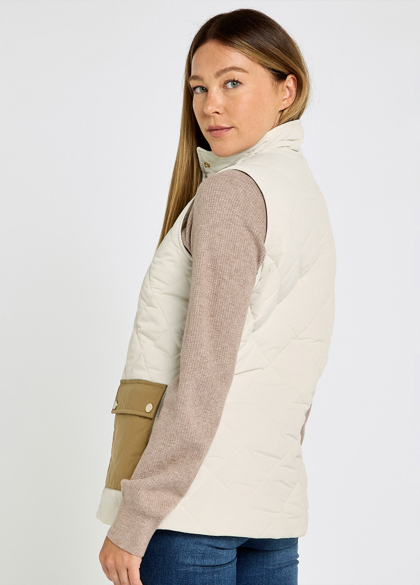 Our Clashmore gilet echoes traditional country style while delivering contemporary design. The neat, quilted gilet with a stand collar, is made from soft touch nylon complemented with statement pockets made from Halley Stevenson wax cotton, woven in Scotland. A perfect underlayer throughout the year but a heritage look that will make an elegant statement on spring days and cool summer evenings